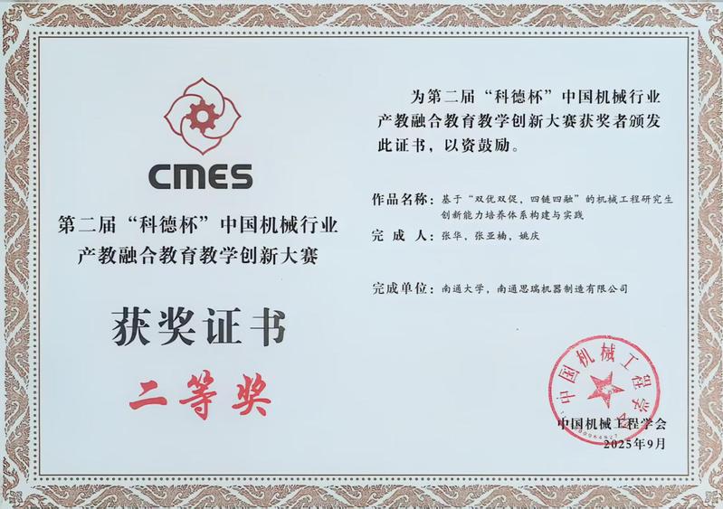 2025年9月19日至21日,由中国机械工程学会、中国机械行业卓越工程师教育联盟主办,广东工业大学承办的第二届“科德杯”中国机械行业产教融合教育教学创新大赛全国总决赛在广州举行,来自全国117所高校的137项作品从区域赛脱颖而出,进入总决赛。yl23455永利集团张华教授主持完成的研究生教学成果“基于‘双优双促,四链四融’的机械工程研究生创新能力培养体系构建与实践”荣获大赛二等奖。